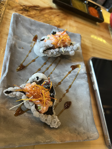 The ceviche marusu was to die for. They had sweet potatoes in for a Peruvian twist? And it paired up so nicely with the rest of the ceviche. We then ate the fried shrimp Which was good with a yummy sauce. Next we devoured the pad Thai- definitely not what you will be used to- but it’s a nice fusion with charred octopus and these delightfully light .. tofu ? Bits .. was weren’t sure what it was but it was so delicious! We tried the scallop parm and octopus sushi which was good. I am a bit of a sushi snob so it was a bit too much rice for me but to others it was perfectly fine. Despite that, the sushi rolls all unique tastes and delicious elements to it.