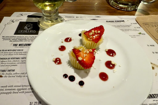 In April 2025, Ofrenda served craft beer from Mundo Quechua Cusco. We chose the Tayta IPA, intense hop flavours and aromas (25 Sol). Matched well with our food. For starters, we chose the warm quinoa salad with goat cheese (27 Sol), made with three types of quinoa with chestnut praline and peppers. The goat cheese with balsamic vinaigrette tomatoes had a rich taste and the accompanying salad was tasty. Nice starter. For the main course, we ordered the lomo saltado (55 Sol) beef tenderloin sautéed with vegetables accompanied by Andean potatoes, rice, avocado and a quail egg, presented in an original way with a small flower in the middle. The meat was well-done. The sautéed rice was hard and reheated before serving. Just fresh rice from a rice cooker is a better option. A small dessert with mint tea was offered by Francisco the waiter. He did a good job.