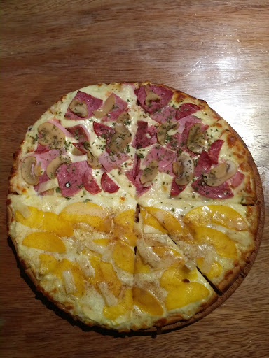 We had half of pizza Hogar (16 soles) and half of pizza Tropical (15 soles). The pizzas were very delicious, we got immediate attention and got the order in less than 15 minutes. It was full, we were lucky to get a table. I was surprised how fast we got the attention, as I read other reviews complaining about the waiters. We also got a liter of lemonade for 9 soles, which was not as potent, but still good for washing down a pizza. You get two sauces for free, chilly and mayonnaise. Also you get a free appetiser, so you can wait for the pizza even if you are very hungry....