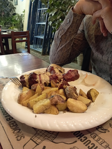 La fachada es super sencilla una puerta de doble ala, redondeada en la parte superior, una amplia entrada muy decorada a lo antaño con muchos detalles de plantas en macetas y adornos como calderos antiguos a leña para dar calor al ambiente. La atención me agradó a pesar que estaban atareados mucha gente pero bien acomodada. Al ver los platillos venir a otras mesas, ya nos antojaba y el paladar lo deseaba. Muy buena presentación de los platos, el costo vs la cantidad en lo justo y más aún el sabor muy delicioso 😋 todo, las bebidas super refrescantes y las bebidas como cócteles espectacular, recomiendo el cóctel 🍸 de la casa 😎.