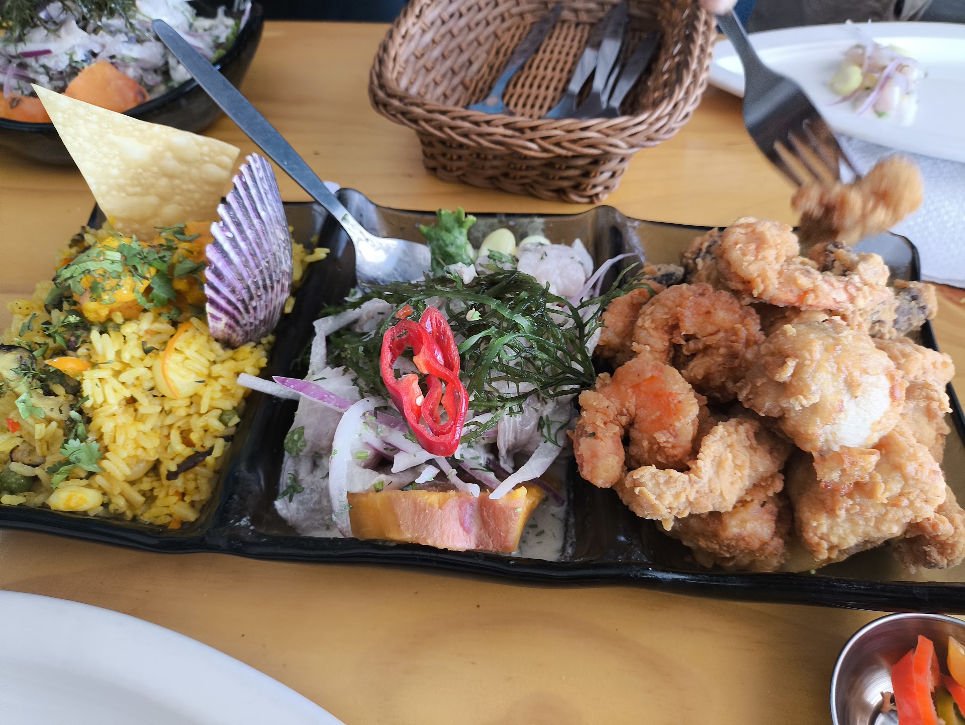 Read moreComida (3) servicio (4) ambiente (4) La comida es buena pero no destaca mucho en sabor, pero es buena, el ceviche es agradable, el arroz con mariscos no es tan bueno, y los chicharrones, se sienten aceitosos. El servicio es bueno en general, los mozos son amables y te atienden rápido. El ambiente es bonito, está cerca de la municipalidad y del malecón. En cuanto a los precios son algo elevados el plato de fondo mínimo es 35 soles, los combos están alrededor de 50 soles y no es mucho, pero en general es...