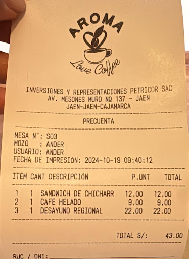 Me llevo una mala experiencia, siendo turista vine a tomar desayuno, pregunté si había leche deslactosada, me dijeron que no había, entonces solicité un café helado, y cuando me lo traen me viene un café con leche con hielo batido que comúnmente eso se llama Frappuccino, le dije señorita si yo solicité un café helado y me dijo eso se llama café helado acá en Jaén es con leche y le conteste pero si le consulté que si tenían leche deslactosada? y me dijo que no! es por eso que pido un café helado! Bueno decido tomarlo y encuentro el café lleno de azúcar en el fondo de la copa! Si yo no le pedi azúcar! Y si yo soy diabético y tomo mi café sin azúcar!!!! Despues pedí un pan con chicharrón, el pan claramente fue de un día anterior no era fresco todo arrugado ese Ciabatta, le dije si me lo podía calentar y me dijo lo meto al microondas sale duro y si quiere caliente ps es cuando recién sale del horno!!!! Que pésima atención sobre todo para uno que es...