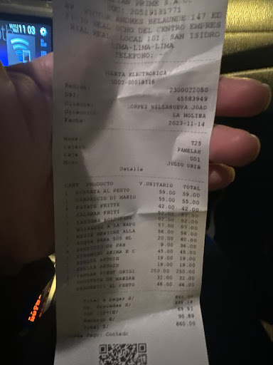 Read morePathetic experience with food. Ordered Cotoletta de lemo and the meat was stale. Left it on the plate and I ate only the potatoes and vegetables. The fun part was when waiter asked if I would like to pack the leftover meat for home.. no question about what is wrong or if the food was good.. OMG 😧. Did not check the bill and later found 18 soles was charged for the bread provided which we did not order. Most Italian restaurant I have been offered complementary bread and have the courtesy to inform upfront when it is chargeable. Service was good with attention but they miss the customer focus....