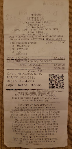 Read moreEra domingo 7 de Julio de 2024, ya era tarde y me dió ganas de comerme una hamburguesa para llevar, he comido hamburguesas y esta ha sido la más asquerosa de todas, grasosa hasta decir basta y al guacamole, estaba tan salado q solo de medio probarlo sentía q tenía un trozo de sal en la boca. Decepción total, MAS NUNCA COMPARÉ ALLÍ. Aquí adjunto el recibo para q vean q fue en el local de Miraflores. Si recién pongo mi comentario, es porque ya había regresado de mis vacaciones en Perú y me había olvidado, hasta que por casualidad conseguí el recibo y me acordé que tenía q poner mi comentario. NO COMPREN ALLÍ, si aún así deciden comprar y su experiencia es muy mala, no diga q nadie se lo dijo. Mi sobrino me comentó hace un rato q en Bembos de Trujillo también la hamburguesa era una asquerosidad. Q hamburguesas tan de muy baja calidad. Odio McDonald's, pero creo q las de McDonald's son mil veces mejores q...