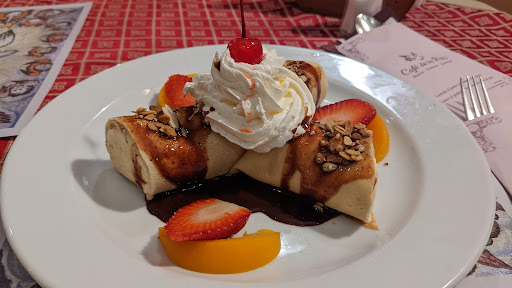 We ordered all four dishes at the same time, but thinking that they would bring them out in a logical order. We were served the crepe suchard (which has ice cream) first. A few minutes later, the soup came out, promptly followed by the appetizer rolls. And then a minute later the last dessert crepe came out.