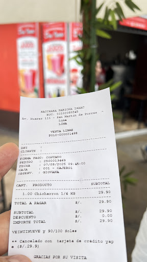 Todo bien, pero me parece q falta algo de limpieza , pisos manchados , mesas pegajosas , sillas con manchas - nada difícil de arreglar . Pero a considerar . Un desayuno clásico de chicharrón , café , pan , acá es . Los precios aceptables, las porciones grandes , sabores caseros . Tienen envío a domicilio. Un detalle importante es q pedi un cuarto de kilo de chicharrón que lo sirven con camote y cebolla , pero lo distinto es q puedes pedir q te frían los cortes de chicharrón osea además del.frito normal pueden freír los cortes . Ese día se pidio chicharrón 250 gramos , tamal de chancho - porción grande con cebolla recomendado , café con leche y café - todo rico . La.mesa con servilleta y limpia . Lo malo : losmchicos con zapatos sucios , abrieron la puerta de una camioneta por dentro un asco y sacaron algún insumo . Puede q sea alguna tontería , pero no me gustó ese detalle . Regresaría de...