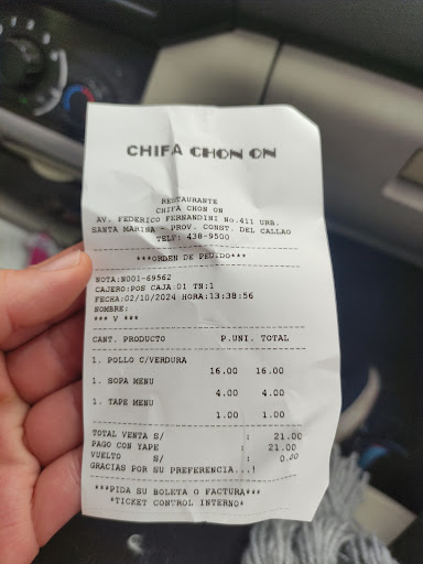 La comida es buena pero la atención es mala empezando por la señorita que estando yo esperando en la cola por pagar mi pedido para llevar ella atiende primero a 3 personas q aparentemente habían consumido en salón, deberían capacitar a su personal a ser más ordenados además que respondió " igual mami tu pedido va a demorar" me parece una respuesta poco atinada y por culpa de un personal asi que se cree dueño del restaurante se genera un malestar en el consumidor, adjunto la boleta para que constanten la hora y fecha con el personal a...