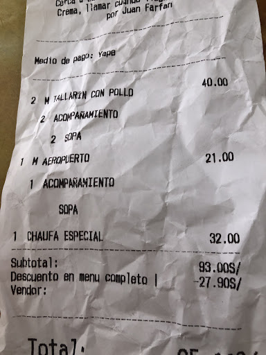 Read moreSirven bien, el sabor de los platos es muy agradable, pero hay que resaltar que, el pollo que viene en el arroz chaufa tiene un sabor bastante característico y muy rico (es como si lo hubiesen macerado). No se compara a otros chifas de la zona, ni de lugares similares. En general, sus platos son agradables y bien servidos, la atención no es mala y te sirven...