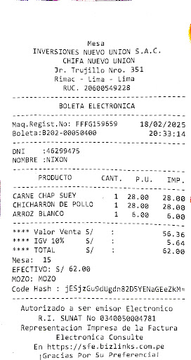 Read moreEl 22 de julio fui a celebrar el santo d mi madre, no había regalo ni ningún detalle para la cumpleañera, pedimos la especialidad que son sus tallarines salteados con chancho, el plato nos costó 25 soles, ni a mi, ni a mi hermana ni a mi mamá nos gustó mucho, el jugo del tallarín era muy aguado, no había mucho chancho y era cortado muy fino, en particular pedimos fideos gruesos porq como dije es la especialidad, n estaban bien cocidos, n nos agrado el sabor de esos platos, mi papá se pidió un chancho asado con tamarindo, venía sin arroz, tuvo q pedirse un arroz chaufa d mariscos aparte, el chancho con tamarindo estaba en algo pero igual seguía pobre para su precio, para 25 mejor me iba a otro chifa y me vendían a menos y con arroz, el arroz con marisco n estaba tan rico, estaba seco, n lo comimos, el local tenía señal cerrada por lo q n podía usar mi internet, lo único bueno fue la atención...