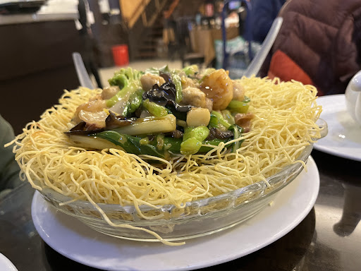 We got the crispy egg noodles with seafood gravy (aka tallarin frito) & half a peking duck. The duck was tepid and not crispy but the flavor was so on point that we were happy with it. Noodles were crispy, umami, and loaded with garlic. Jasmine tea to wash all the grease down. Coming from very discerning Shanghainese taste buds…this food hit the spot!!!