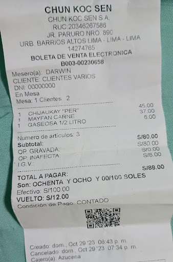 Read moreSiempre pedía la sopa wantán especial porque era mi favorita, pero esta vez me llevé una gran decepción. La sopa vino con muy poca carne (solo unas pocas tiras de pollo y dos lonjas de chancho), apenas dos huevos de codorniz, unas cuantas hojas de espinaca, muy pocos fideos y bastante caldo. Antes siempre venía bien servida, con buena variedad de ingredientes: pollo, chancho, langostinos, verduras y abundante proteína.