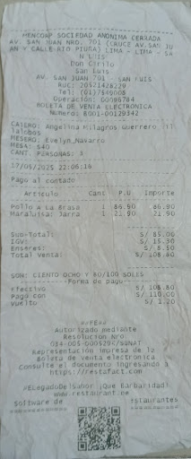 Read moreDemasiada bulla, parece discoteca. Además cuando cantan el cumpleaños hacen tremendo escándalo,(tremendo comercial) que rompe el hilo de la conversación. Y si hay bebes en cochecito, los despierta. Recipientes muy pequeños para la cremas. Es incomodo pedir y pedir cremas, cuando es bien sabido que en Perú nos encanta abundantes cremas. Falta alguna promoción con gaseosa o chicha, un pollo casi 60 soles sin bebida es un exceso. La atención tipo peruana nada esmerada. Tuve que pedir dos veces cremas también pedir el aliño pues mandaron la ensalada sin el mismo. (mozos con falta de criterio) Compren un microondas, pues necesitaba tomar la chicha temperada y el mozo dijo que no hay forma de entibiar ni nada. (mal) Buena locación. Faltan detalles que atender. Por un momento tuve la sensación de que estaba almorzando en un patio de comidas de algún centro comercial. EL pollo estába rico, pero no wau! Por el precio y la zona, consigo más sabrosos y en otro zona, incluida bebida. PD. Las papas...