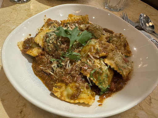 Pedí los platos que observan en las fotos, precio promedio de 40 soles. Los ravioles muy ricos que es lo que comí, rellenos de espinaca y queso ricotta con buen balance, para nada desagradables. En cuanto al fetuccini, la masa estuvo muy buena, masticable y digerible al gusto, en cuanto a la salsa blanca en mi caso me cae pesado todo lo que lleve leche así que lo poco que probé me agradó. Eso si los platos parecen poco pero te llenan.