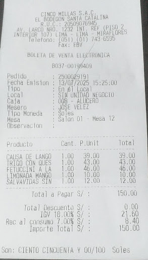 Read moreEn la semana conocí El Bodegón en el Aeropuerto Jorge Chávez, salidas nacionales. Probé un arroz con pollo y huancaina y estuvo rico. Su pisco sour también bueno. Ello me animó a ir a su local de Santa Catalina hoy, domingo 13 de julio de 2025, y vaya desilusión que me llevé, definitivamente fue mi primera y última vez. El ambiente agradable, y la atención también buena. Local muy lleno, no entiendo porqué, al parecer, ya el buen paladar se ha perdido en Lima. Luego de esperar unos 30 minutos para conseguir una mesa, pedimos un refresco de mango y naranja (horrible, muy dulce, con hierbas flotando y trozos chicos de mango, que al pasar era desagradable), tomé un sorbo y lo dejé. Un refresco llamado Salvavidas (de frutos rojos) muy agradable, fresco, recién luego me percaté que era el refresco predilecto de los comensales. Luego pedimos una causa de langostinos, y estuvo rica, aunque se excedieron en la cantidad de salsa wolf. Los platos de fondo, dado que se acabó el cau cau, fueron unos spaguetis en salsa blanca con champignones, y jamón, y francamente tuvimos que pedir sal y pimienta para intentar pasarlo, horrible, no es su fuerte, no lo pidan. Además costó 46 soles, y sólo era fideos, sin pollo. Para nada justifica el precio, un mímimo de pollo debería tener un plato de 46 soles. Y el otro plato fue trigo con chancho, y otro desastre, no es su fuerte, desagradable. Mi casera del menú hace un trigo mucho más agradable, con sabor, por 17 soles. Y este plato costó 43 soles. Al final pagamos 150 soles, más la propina, y salimos con la sensación de habernos equivocado de restaurante y de haber invertido mal nuestro dinero. Creo sinceramente que, al Bodegón hay que pedir sólo algunos pocos platos que puedes disfrutar, si no te informas antes, ya fuiste. Debe tener algunos platos que lo saben hacer, pero yo prefiero ya no arriesgar, teniendo...