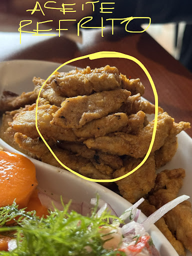 Luego, al ordenar me traen un vaso roto, que es peligroso y estaba con filo, le digo al mozo que lo cambie por favor y primero lo mira molesto a buscar aver si tengo razón y bueno lo lleva y me trae de mala gana uno que tenía un olor horrible como a trapo sucio. Luego, al traerme un ceviche con chicharrón noto claramente que el chicharrón estaba refrito, frio, excesivamente grasoso (adjunto fotos del antes y despues). Le llamo a decirle que ese chicharron estaba mal, hasta en una carretilla se encontraba un chicharrón crocante y que sabes que no te hará daño. Me dice el mozo “y que quiere que haga?” Le digo cámbialo si fuera posible, lo cambiaron de mala gana. Para lo que sí tuvo ganas fue al pedir propina al cobrar la cuenta. 1 jarra de chicha, 1 ceviche y un arroz con mariscos masomenos por 100 soles. Honestamente hay muchas mejores opciones por la zona y más barato. Hasta miramar o el mercado estaba mejor