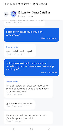 Read moreSe hizo pedido por Rappi, no actualizaron el estatus en la app y no asignaron a un repartidor. Pidieron que cancelara el pedido ya que decían que el pedido estaba listo pero no llegaba el repartidor lo cual no fue así porque en la aplicación salia en preparación. Dejaron de contestarme y no hicieron nada para resolver el problema aun cuando el pedido ya...