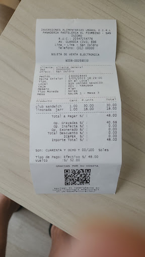 Read moreFui a desayunar el domingo 27.08.23 Había pan con chicharrón. Entonces en la carta vimos que ofrecían chicharrón de pareja, o sea para dos personas, lo cual comprendía 1/4 de chicharrón con camote y salsa criolla. Lo curioso es que el mesero me preguntó si quería pan 😁. Raro porque un pan con chicharrón debe tener pan, cierto? Me dijo que no incluye. Bueno... le pedí dos panes. Tampoco incluye el café pero eso lo puedo entender... aunque son tacitas pequeñas. Pero que un pan con chicharrón no incluya pan??? Raro. Queda claro que lo que ofrecen en un baner a la entrada no es lo mismo que indican en la carta. 👎🏻 Todo eso me costó casi 40 soles. Definitivamente más, mejor y más rico es comer en Chicharrones del Inca. Por lo mismo te compras dos sanguches grandes (INCLUIDO EL PAN), dos cafés regulares, una buena porción de salsa criolla y un tamal. Por otra parte, hay mucha bulla en el ambiente que no te permite disfrutar la comida. La licuadora, los golpes de los meseros cuando mueven la cosas, y siempre la gente muy mal educada que alzan demasiado la voz... aturde y no te deja conversar. No recomiendo comer el pan con chicharrón sin pan en ese lugar. Deben ser más sinceros en vender lo que ofrecen en...