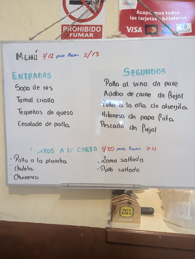 Read moreEl local es amplio y fresco, en una casona de techo alto, no hay un cartel de publicidad en la calle. Las mesas de madera ya cuentan con los cubiertos colocados y con asistencia de mayonesa, ají, limón y servilleta. El menú es variado, destaca la sopa que es sustanciosa y con verduras, también puedes pedir una ensalada de palta (abocado). Algunos platos de fondo a comentar: 1. Ronda Crioolla, un plato tendido con 3 tipos de segundo, seco con fréjoles, cau-cau de mondongo y ají de pollo, con una guarnición de arroz al medio, estuvo pasable, pero llena. 2. Tallarines rojos con carne picada y papa con crema huancaina un poco mejor. 3. Lomo saltado que se puede pedir con fréjoles o menestras. Y para asentar un vaso de te manzanilla fresco o caliente. También hay platos a la carta, no observe ninguna publicidad de pagos con tarjeta. Observe bastante asistencia de personas, obreros, parejas, en traje, universitarios, jovenes, maduros. Todo el local y mesas bien limpias. Precio del menú S/. 10 (Oct 2018). Lo recomiendo pero...