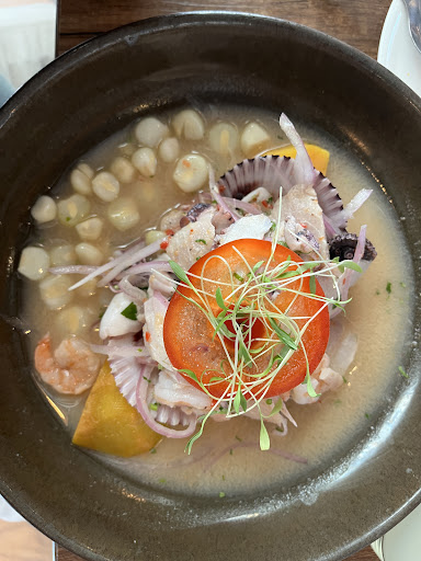 Muy recomendable, un local algo pequeño pero muy bonito con un ambiente agradable, la atención fue se primera A1 todos muy amables anfitrionas, meseros, el del carrito de postres todos hicieron muy confortable ésta experiencia trejeron la comida y bebida a su tiempo así mismo con la cuenta, Henry un mesero muy amable me recomendó la promoción del trio marino que estuvo muy agradable el ceviche en su punto el arroz con mariscos buenazo y el chicharrón de pescado le faltó algo de sabor pero se complementó muy bien con la salsa tártara, la chicha se nota que no es como la de casa es como la de cualquier otro restaurante pero con su limón ya pasaba, los pisco sour de cortesía si estuvieron buenazos así mismo los postres ese chesscake de sauco una delicia y lo mejor fue que gaste menos de lo que pensaba, algunas cosas por mejorar: la chicha y un toque más de amor al chicharrón de pescado ah me olvidaba tambien tienen menú kids para niños arroz o papas fritas con chicharrón de pollo o pescado aunque eso tambien podría mejorar y servir el arroz y papa frita para la porción de un niño no es mucho y para el precio (17 so) se vería mejor, por lo demás voy a tener que volver a probar otras comidas aunque por ésta visita le...