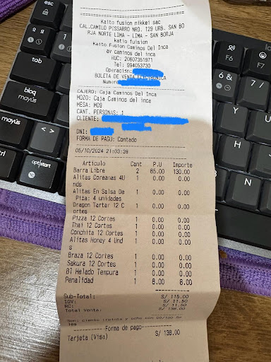 En total, gastamos 138 soles mal invertidos. Hace un año era un buen restaurante, pero en su estado actual no lo recomiendo. La atención es pésima y las meseras carecen de tacto. Dejo la boleta como prueba de que,...