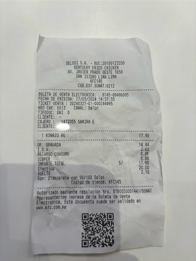 Me cobró y como todos los KFCs no tenía monedas para dar vuelto.