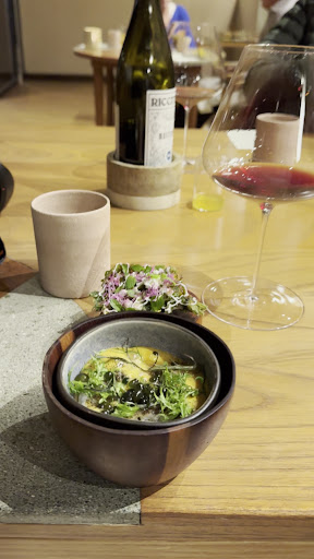 The ambiance is minimal yet elegant: wooden and marble tables without cloths, spacious seating that ensures privacy with clever dividers, and a high wooden ceiling that creates both warmth and openness. Even small details, like individual bag stools and the variety of cutlery presented with each course, reflect thoughtful design.