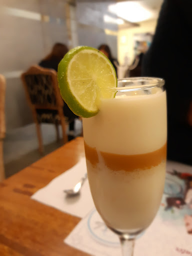 Eclectic decor, shabby-chic. Food was good, the tender, juicy salmon with capers, creamy risotto and asparagus. I enjoyed a freshly made drink with milk and lucuma, even without adding sugar it was sweet and delicious. The açai bowl was a generous portion and came with up to 4 toppings, which were presented as distinct stripes across the top. I chose sunflower seeds, kiwicha pop, chia, and flax. Other options were honey and pollen. Pictured is also a dessert that a friend ordered....