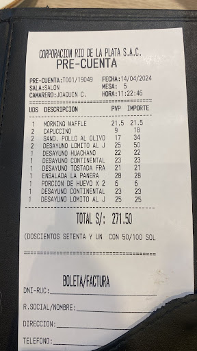 Read moreRecientemente fui a La Panera a desayunar y probé el desayuno criollo y el desayuno de lomito al jugo. La experiencia fue buena. el desayuno criollo, que incluye una butifarra, tamal, café y jugo, fue delicioso. La butifarra tenía el sabor auténtico y tradicional, con un pan fresco y crujiente. El tamal estaba en su punto, con una textura suave y un sabor muy bien equilibrado. El café era aromático y fuerte, perfecto para empezar el día, y el jugo fresco añadió un toque refrescante a la comida.El desayuno de lomito al jugo también fue espectacular. El lomito estaba tierno y jugoso, acompañado de un jugo que realzaba todos los sabores. La combinación de ingredientes y la calidad de la preparación realmente se destacaron.El ambiente de La Panera es acogedor y cómodo, ideal para disfrutar de un desayuno tranquilo. El personal fue muy amable y atento, asegurándose de que tuviéramos todo lo que...