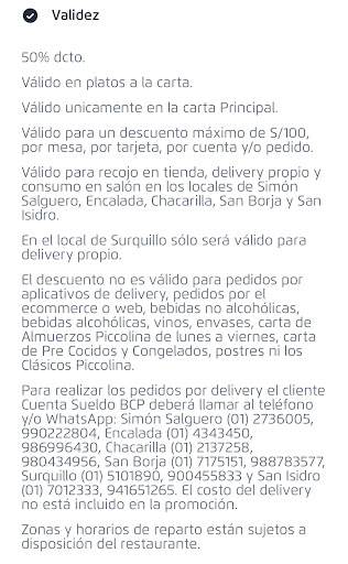 Read moreTengan cuidado con los descuentos de banco. En las condiciones indicaba que sí valía para la carta principal pero aparentemente la carta que te dan no es la principal, dentro le ponen subtítulos como para despistar y generar confusión. En resumen, no vale para toda la carta principal, parece que más son las restricciones que lo que realmente vale el descuento, generándote una muy mala experiencia. Por ejemplo dice que no vale los clasicos piccolina pero aparentemente es una sección de la carta principal. Además, parece que los mozos ya saben del problema porque explican con mucho detalle todas las restricciones. Mejor pongan para lo que vale, de lo contrario pésima experiencia. Con respecto a la comida, estaba alto en sal, pedimos un pescado a la menier y un filete de pollo con pasta aglio olio (salado, pasta sobrecocida). Además, la atención es mala, los tres mozos estaban más tiempo frente a la tele que atendiendo a los clientes. Tuvimos que pedir dos veces que nos atiendan y ninguno quería atender. Si hubiera cero estrellas, eso es lo...