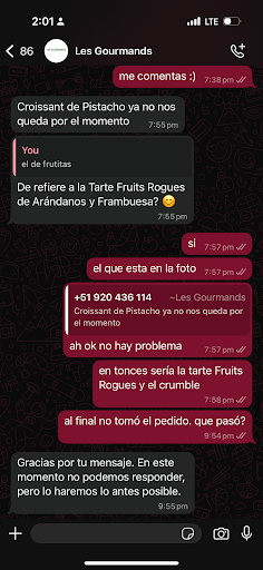 A las 6 p.m. confirmé nuevamente que estaría en casa a esa hora, y cerca de las 7:20 p.m. conversamos sobre los productos disponibles. A las 7:55 confirmé mi pedido, pero desde ahí no recibí más respuesta. Estuve escribiendo varias veces y a las 9 p.m. me apareció que ya no podían responder.