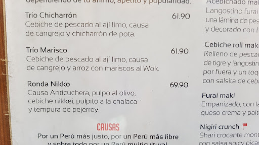 Read moreEdición 2025. Tacu tacu en salsa batayaki. Lo anoto aquí para pedirlo la próxima vez. Algo que no veo en la carta y era buenísimo era el sudado. Pero pidanlo, a mí me lo trajeron a pesar de no estar. Arroz con marisco, muy bien. Este lugar ha cambiado de carta más de una vez pero no falla. Imperdible. Siempre una grata experiencia. Pedí de entrada un trío mariscos, que no se por que se llama así ya que tiene ceviche de pescado, y los otros dos son causa rellena de cangrejo y ahí sí, arroz con mariscos al wok. Por un poco más de dinero me dieron el ceviche con lenguado, buenísimo. El arroz también es bueno pero cuidado con la salsa de rocoto que es súper picante. La causa no fue nada espectacular. El siguiente plato fue el aeropuerto Nikki. Si les gusta la comida que tenga un toque oriental y dulce ese plato les va a encantar. En general, para comer rico este lugar no tiene pierde. La atención sobresaliente también. Lo único malo es que no es tan acogedor en verano ya que por pandemia no hay aire acondicionado ni ventiladores, y hace...
