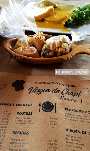 Nada más grato saber que en Chaclacayo también puedes degustar la comida Arequipeña...dónde ? ... Virgen de Chapi. Buen ambiente, amplio, espacioso y buena atención, su carta es primordialmente Arequipeña, aunque también ofrecen otros platos. Pedí el infaltable rocoto relleno...humm ni un apice de picor, ocopa ,adobo... pero no encontré la cerveza arequipeña !!!, lo mismo me pasó en otro restaurante arequipeño...no sé qué...