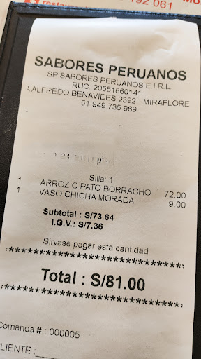 Read moreMalísimo. Al llegar me sorprendió que estuviera vacío (sábado a las 20:30), pero no me preocupó mayormente. Pedí Arroz con pato borracho (casi 60 soles), y la verdad, no tenía ninguna gracia, desabrido, la verdad podría haber sido pato/pollo con arroz sin ningún apellido y no existía ninguna diferencia. Me parece que lo que cobran es una verdadera estafa, por ese precio puedes comer en cientos de lugares en Lima mucho mejores. Es una pena que teniendo una gastronomia tan rica existan lugares como este, que cobran una sin verguenzura por un plato que debería costar la mitad de lo que vale. Lejos el peor lugar en el que comí durante mi visita a Lima. De verdad salí sintiendome profundamente estafado y entendiendo porque se encontraba vacío...