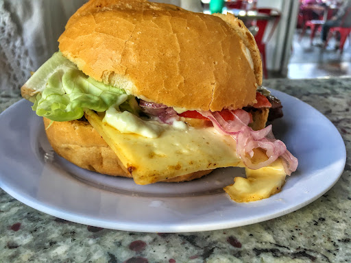 Not my first time here. I'm giving 4 stars cause this time the bread they used for the chicharrón sandwich was too crunchy, it was like they heated it up in the oven. I still love this place. I easily say that is my favorite -until now- for eating chicharrones (roasted pork meat) in Lima It's located in a centric area of Miraflores district. The restaurant has over 50 years selling this must have The amount of meat they put in the bread is very generous, you can choose your sauce (mayo, golf, spicy, etc) and also the toppings (lettuce, tomato, sarsa criolla -chopped onion with lemon juice salt, pepper and spicy chili- and fried sweet potatoes) you can put all of them if you want Personally I prefer the onion and sweet potato on the side and mayo and spicy sauce in the sandwich The bread is very big and you might struggle a little to eat the whole sandwich They are famous for chicharrón but also have other meats Worth of trying if...