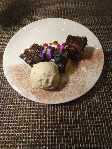 De postre, nos trajeron un brownie con helado (no recuerdo la especificación), pero parecían tener pistachos. El brownie no me agradó mucho, tenía un sabor curioso, como a guardado (?), pero no puedo decir que sea por eso, tal vez es por la preparación (cada uno prepara los brownies a su manera), a mi novio le gustó, así que todo bien. El helado estaba rico y era refrescante probarlo.