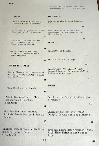 Read moreThis is going to be hard to write… The only reason that Siete is getting 2 stars instead of 1 star is because of the service which was just fine. At the recommendation of a local, I made a reservation at Siete for their tasting menu. I wish I hadn’t. Turns out, there is no tasting menu. It really is the chef choosing 6 menu dishes (forgot to take a picture of one) and serving it. I know because the bill was itemized. Unfortunately, because I was so mad about the meal, I didn’t take a picture of it to show what I ate. The scallop ceviche was good, the salad was fine. The next dish (no picture) was fish over a fritada with a red sauce served in cast iron pan was pretty bad or at best not good. The 4th dish which looks like poop was pork (I think) and tasted like poop; not literally, simply outright BAD. I had one bite, forced a second, and then was done. The 5th dish was fish with tamale in the pepper. It wasn’t good. I think the last dish was flan. Same, it wasn’t terrible, just not good. This was my second worst experience in Lima, but it was by far the worst value. The worst place cost me a third of this. If I had known they were charging me per dish I would have walked out after the poop dish. The local who recommended this restaurant is no...
