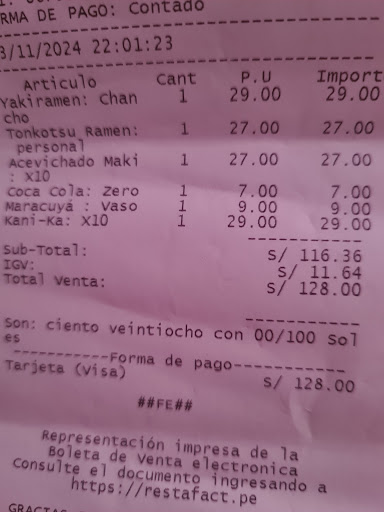 Read moreTOME, es uno de mis primeros acercamientos a la comida nikkei, y puedo describirlo como una muy agradable experiencia. Está ubicado en la intersección de Húsares de Junín con Jirón Huáscar, en Jesús María. El local es apacible, cómodo, inspira calma, la decoración es idónea para el tipo de restaurante que es. Atraída por las fotos que había visto em su instagram, lo primero que pedí fue un Yakiramen de chancho (29 soles), es una suerte de tallarín saltado con fideo ramen, y verduras, con un sabor peculiar, rico, lo volvería a pedir. Luego vino la sopa ramen, llamada Tonkotsu, también rica (27 soles). Luego pedimos majis acevichados que a diferencia de otros que he pedido en diferentes locales, venía con cebollita china picada, muy agradable (27 soles x 10 cortes) Y finalmente los makis Kani-ka, muy buenos, realmente muy buenos (29 soles) No sé si me vuelva fan de este tipo de comida, pero si acaso me provocara, Tome será mi opción...