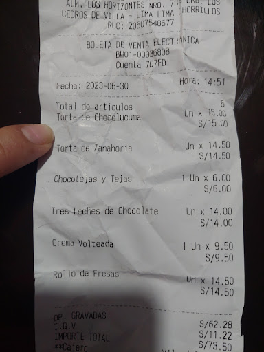 Read moreAlgunos dw los postres son ricos, lamentablemente el servicio no es bueno. Cuando he pedido para comer ahi, se han demorado y se equivocado con el pedido. Hoy pedi para llevar y una vez más se equivocaron con mi pedido. Me dieron la bolsa engrapada con los postres dentro y cuando llego a casa resulta que en vez de chocolucuma como pedí y pagué (aqui adjunto el recibo) me dieron un tiramisu. La Calidad de la torta de zanahoria ha bajado esta muy seca. Al darme cuenta intenté llamar a la cremoladeria y Ninguno de sus teléfonos en las...
