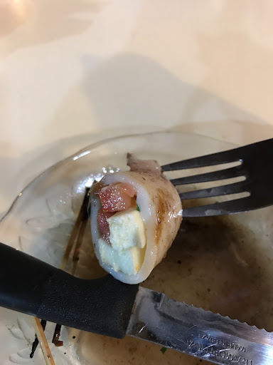 Squid came delicately stuffed with tomato and cheese (likely mozzarella). Scallops came topped with a lightly crisped Parmesan type cheese, again excellent. The main fish was perfectly cooked and very fresh. Also, the salad dressing on the small salad was something special too.
