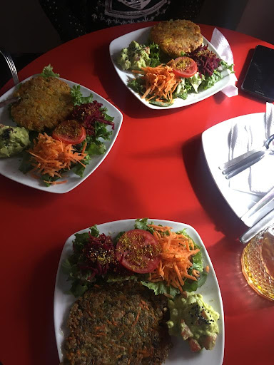 For our main course, we tried the quinoa pyramid dish with sauteed vegetables and plantains and the veggie burger. Both were delicious as well and came with salads and a free hot tea.