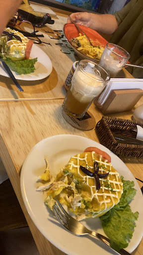 Read moreTotalmente impresionada con este Café. La atención al cliente fue buena, además de que el local estaba muy bien decorado y contaban con aire acondicionado. Nunca habia probado la bebida de cacao y me sorprendio lo deliciosa que era, pude notar algunas notas de limón. El café americano igualmente muy rico punto a agregar tenían vajilla personalizada para este. La comida, creo que es su punto debil me pedí un fettuccini con huancaina y el sabor de la huancaina era casi nulo, la hamburguesa de filete de pollo igual, nada excrpcional. La carta era variada pero a la vez limitada (Solo contaban con hamburguesas de carne y filetr de pollo), no tenian la Lasagna disponible ni las diferentes maneras de preparar el café que se ven al inicio...