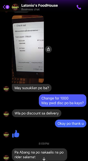 As an avid customer of Latonio's I was deeply disappointed by my recent encounter w/ their food del service. I received a notif at 8:09pm that my order was en route and I immediately responded and waited in front of our gate to avoid inconveniencing the rider. At 8:18pm, Latonio's asked bout my food's whereabouts, followed by another msg at 8:21pm stating the rider's repeated attempts to locate me. Situation escalated when I received an agitated call from an unknown number, and that was the frustrated rider/owner. Despite my efforts to cooperate, the rider's tone conveyed annoyance and impatience. Eventually, I was directed to get the del at Phase 2 intersection, a soltn offered w/ palpable irritation. To make it lil bit shorter, we still met in the address I gave them. Confusion ensued as the rider claimed to search me in diff location...(sa kabilang street daw sila) but still while talking to her backride she also keep on talking bout her frustration coz she wasn't able to see my address. (Thanks to her backride na maayos kausap) This disappointing experience tainted my perception of Latonio's del serv and raised concerns bout professionalism and customer...