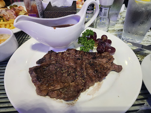 Definitely not recommending this restaurant to anyone. Maybe to my enemies, yes. They served us a steak that's dry and rubbery with a sauce that had lots of cracked pepper on every bite. It wasn't seasoned well and it seems like the only good thing about that dish was the handful of grapes. Their "King Prawns Thermidor" is so misleading. They serve you a bunch of shells and heads of shrimp with bell peppers (that was the only thing you can taste) sauce with pieces of cut up shrimp. For ₽600... Big NO. My daughter was craving a burger so we ordered a burger that cost almost ₽400. The fries were no good, salad was so so and the patties were disgustingly dry and burnt! Not caramelized. Burnt. It was bitter. It said on the menu 100% beef and it was definitely 100% not!! We tried to have it replaced and they said that was the standard of their burger so replacing it wouldn't change a thing. We took it home to feed to the dogs. The salmon and prawn (which is actually just shrimp, i don't know if they know the difference) salad was okay in terms of portion but they drenched it with thousand island dressing that we had to "fix" because it didn't taste good. The staff were okay. They were nice but spent a lot of time chit chatting with each other and on their phones. Maybe come here for beer and pool but definitely...