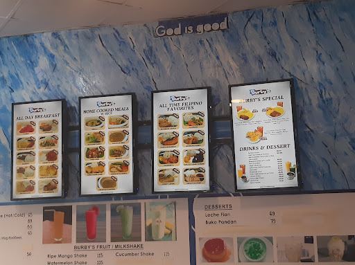 Rip off. Meals are pricey but the servings are small, 5 strips of the blandest fried liempo I've ever had, and why did you give us tutong? We thought it was fried rice with the yet also bland boneless fried chicken, which by the way was nothing but chicken fillet no bigger than mc Donald's fillet ala king but costs 185.00 🙄it wouldn't hurt to sprinkle a bit more salt and pepper on it you know. Tell your staff to stop using their shirts to wipe the plates it's disgusting, kahit pa gabi na and very tired na sila, have you no standard to maintain? Burby's is a joke. If your experience is not similar with this one then boy, did we...