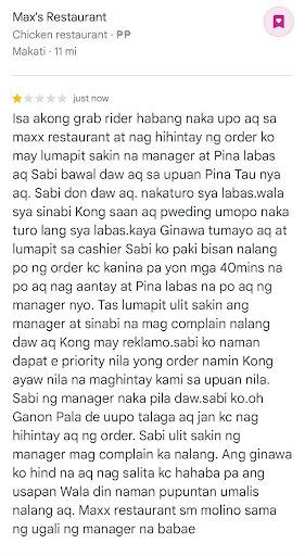 Read moreI recently visited Max's Restaurant in SM Bacoor and was disheartened by the poor customer service displayed towards a Grab driver who was waiting to pick up a delivery. Despite the driver’s patience, he was met with indifference and unprofessionalism from the staff. It’s disappointing to see a lack of respect for those who play a crucial role in the dining experience. Such treatment not only reflects poorly on the establishment but also undermines the collaborative spirit of the food service industry. I hope management takes steps to foster a more respectful environment for all patrons and delivery...