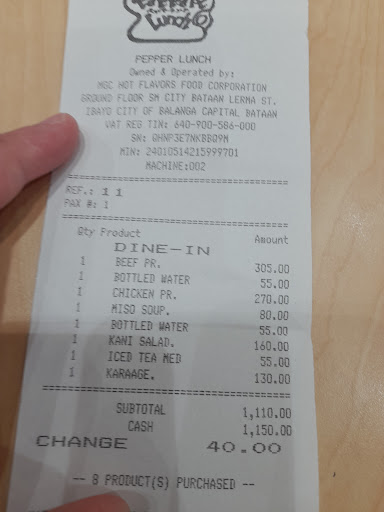 So far, this branch is the most decent branch I've ever been to. The atmosphere is good. It's very neat and clean I think the management did a great job in maintaining its cleanliness. Even though it's a bit small I love that it is not that crowded whenever I pay a visit and the servers and cook were fast in taking our orders. It only took about less than 5 minutes for our food to be served. I guess it's because it wasn't crowded that time. I don't know if that still applies during busy days but I hope that they still do fast and efficient service. The food tastes good. The staffs can improve their friendliness but anyway this is a good branch. I would love to come back here again when I visit Bataan. I also love that this store accepts cashless payments like credit cards because a lot of stores here in SM Bataan only accepts cash or GCASH transactions. Anyway, thank you for the good service! I love my Pepper Lunch...