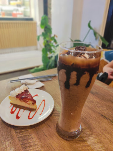 They were super busy that night we visited. They had so many grab and foodpanda orders it took maybe 30mins or so for those who were physically in-store to get their orders. That isn't why I gave them 3 stars, it's understandable and I'm happy for the amount of business they received that night. They have a great atmosphere inside and great staff under that amount of orders, so it wasn't a bother for us to sit, chat and wait for our order. I only judged them with the quality of food. The Dark Choco Chip frap, flavorful and enjoyable. They were not shy with the choco chips, more than enough to notice them in the drink. Now the reason why I felt like a 3 was justified, the slice of strawberry cheesecake received. I enjoy finding places with Cheesecake and end up most times getting one just like this visit. Haha Cheesecake slices are not cheap by the slice. They come in different sizes and can be baked or the non baked type of cheesecakes. So they have different shades of coloring that cheesecakes can look like, hard to tell until you take an piece off the slice. To receive the slice dry and old wasn't acceptable considering the high-quality reputation of this cafe. I'm going to have to guess that the cheesecake must have been more than a few days. When slicing my fork into the cheesecake, it wasn't a smooth motion when taking a piece from the slice. Also the strawberry topping was dry enough that I was able to 90° a portion of the cheesecake. I know its a waste of food to throw out but at that price point, it killed my high review I would have awarded. I'll try again another time with the cheesecake and hope it was just bad...