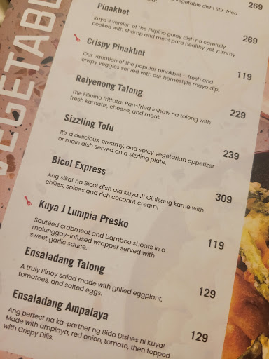 Read moreSorry but I was disappointed with the serving, service also. I took my daughter to treat her together with cousins. And I'm excited as I like to try again the fried spinach and I know food are so great. But then, all what we want are not availble. Leche flan, all deserts like halo2, coffee jelly, that fried spinach,those shake drinks. I got so surprised like it's still early when we get there. We didn't enjoy the food except the sisig, tastes so good and the serving for sinigang omg there's nothing there. And I think they over charge me at my bill so I need to come back and ask them to double check. Are you closing guys? Kuya J is Kuya J. Pls serve the way how it should be served. We waited too long as well and needs to ask side dished before they will serve. What happened?sorry for this review. I need to do this for improvement. Kuya...
