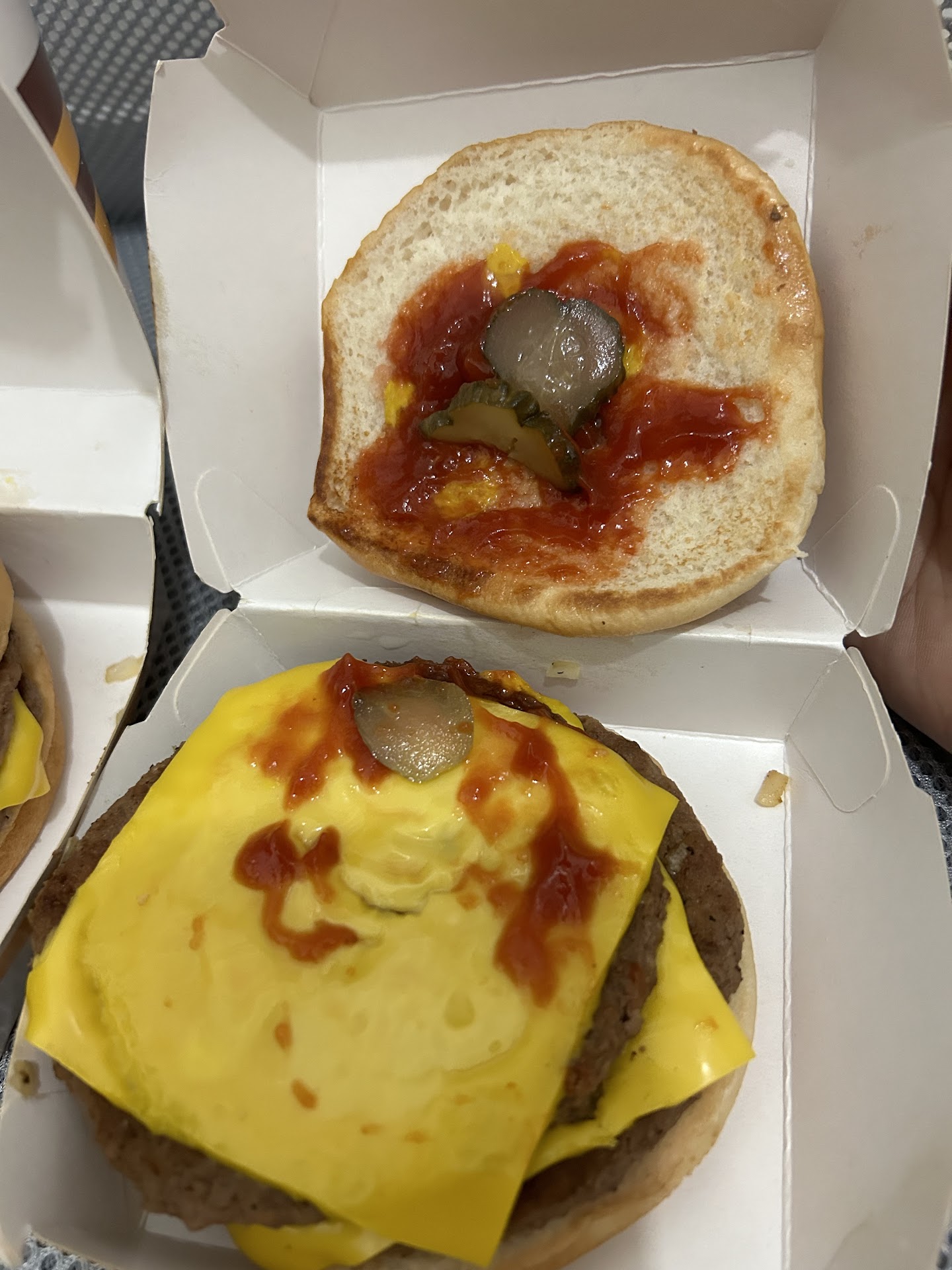 I ordered two double cheeseburger without pickles. But as you can see, they still put it. I even asked the crew if they are sure that there's no pickles as I requested and she said yes. I was not able to check it na because I'm in hurry as they took so long to prepare my order (obvsly messed up). They always have this kind of issue. It's better to avoid this branch due to lots of issue. They don't even call you after complaining multiple times. Ps: I also order three days ago a MPS and they delivered it without sauce, a cheesy eggdesal and they missed cheese. Very disappointed! This will be the last time I'll order here!