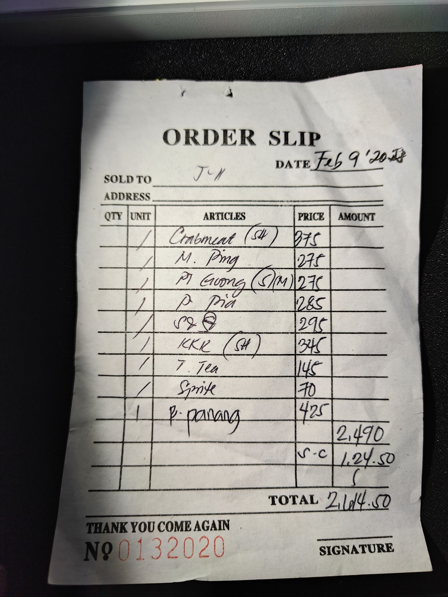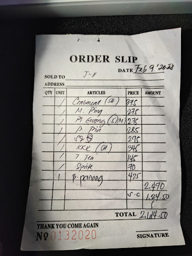 However, when we asked for the bill, the waitress asked my mother if she had a senior citizen card. When my mother replied and started to take out her senior id, the waitress said it was okay. She was just confirming that my mom had an ID and the discount had already been applied. After we left and had coffee from another place, my mother reviewed the "order slip". To our surprise, not only was there no senior discount applied, but also a service charge was added. So our bill turned out more expensive. The worst thing is, we were only given an "order slip". No O.R. or sales invoice.